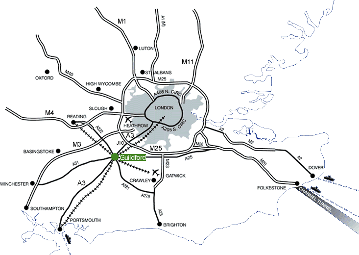 Take the M25 junction 10, head South on the A3 for 10 miles, towards Portsmouth. Pass the small lake just past the junction. Do not take the Merrow exit to Guildford. Guildford Cathedral should be visible ahead of you before you leave the A3. Continue to the next exit for "Spectrum Leisure Centre". Turn left at the first traffic light junction onto A320 and onto the large traffic light junction (Stoke Road Junction). Continue straight ahead, along Stoke Road, towards Guildford town centre, approximately one mile away.