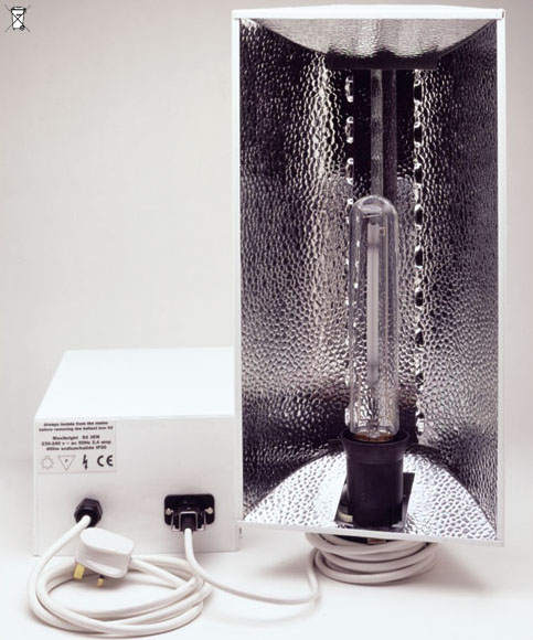 A ballast provides circuitry to start and operate high powered lighting. The ballast is quite heavy because it contains a transformer. The ballast is connected to the mains electrical supply and should be located away from potential flooding and spillage, either off the floor, or outside the growroom. The reflector is typically suspended from the ceiling using chain secured with hook plates. (The use of string to suspend lighting is expressly not recommended because the lighting may heat and damage to string. If the string breaks, this may cause damage to the reflector, lamp, cabling, hydroponic system and your plants. Additionally, damage to the lamp may cause gas to escape and may cause you plants to absorb a high dose of sodium, mercury, or whatever ionised gas is used in the lamp.) The cable from the reflector is connected to the ballast and the lamp is inserted in the reflector.