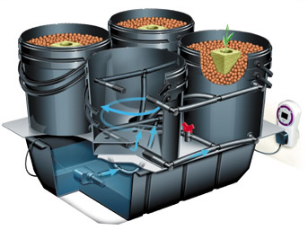 This is a very simple but very effective technique. It is basically a hybridisation of all the above techniques put together. The principles as the description of the title is simple, however very effective. These systems normally use clay pebbles as the substrate, as this medium provides very good drainage and good retention of water, which over a period of time will dry out. A flood and drain system typically works by using a timer and submersible pump. The timer controls the flood and submersible pump. The timer controls the flood and drain cycle of the system . Most flood and drain systems work via a bottom flood, which over a period of pre set time floods two thirds to three-quarters of the growing medium. Then, once the flood cycle reaches the desired height, the pump stops and gravity then pulls the water back to the tank. Then, depending on the size and depth of the system, some time later the cycle is repeated. Conventional flood and drain systems are normally quite shallow i.e. approx 5-10cm deep. However, due to recent developments, we now have on the market deep flood and drain systems. The pod system ™ are approximately 50cm deep. Original shallow flood and drain systems obviously take less time to flood however needs to be flooded more often over a 24-hour period. The reason is that the medium takes shorter and longer periods of time to dry before another flood is initiated, i.e. the shallow flood and drain medium will dry out quicker resulting in more floods per 24 hour period. The great benefit in a deep flood and drain system over its shallow counter parts is that the greater the volume of water used to flood and drain a system, the greater push and pull of air over the root zone will be, i.e. the water acts like a piston in a cylinder of an engine. Each time the system floods, the old air in and around the roots is pushed out from the medium then when the flood completes and the drain cycle occurs, the water then sucks down as it returns to the tank, pulling fresh air in to the root ball maximising aeration around the roots. And because it needs a longer period of time to dry out before another flood is initiated, this drying out process also creates very good aeration to the roots. Then the whole process is repeated. Aeration to the root ball is possibly the biggest factor for healthy, happy, heavy yielding plants and this system gives you it by the bucket load. Again another big advantage of the deep flood and drain system over its