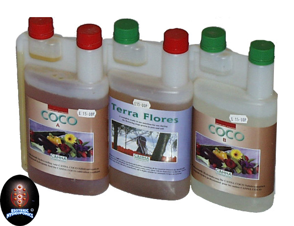 Canna Coco two part nutrient pictured with Canna Terra Flores. The "Terra" range of Canna products is intended for dirt [soil] cultivation, whereas the rest of the Canna product range is intended for hydroponics and other techniques, or is of general use for any horticulture technique.