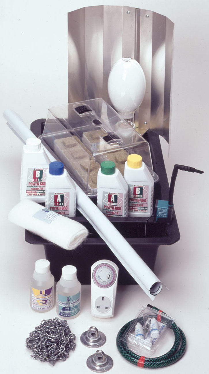 NFT 205 hydroponic system, 500W mercury blend grow light, timer, propagator, nutrients: grow & bloom, pH test kit, pH up & pH down, rockwool matting & blocks, hook plates & hanging chain 5m, 5m of black & white reflective sheeting.